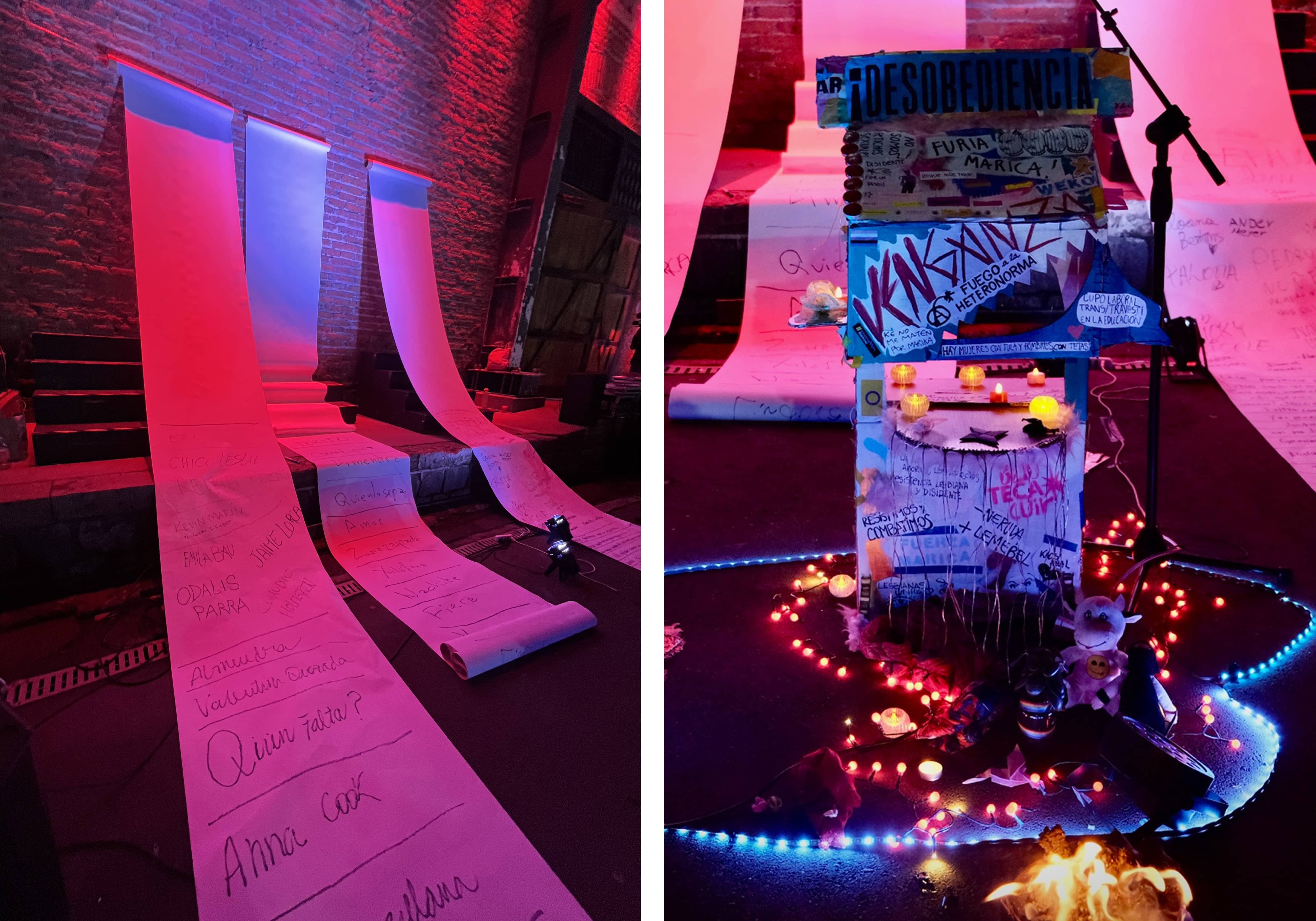 A partir de este juego popular, surgió posteriormente Bachillerato Marika para no olvidar (figura 17), una performance de resistencia y memoria que formó parte del Festival Desviaciones de Artes Escénicas y Disidencia Sexual en Chile. Al igual que las metodologías ya planteadas, esta propuesta se basa en el juego tradicional, pero haciendo eco de la violencia contra las identidades sexogénero disidentes del país. Propone tres categorías sobre las cuales decir “detente”: Nombre, apodo, y un mensaje para una de las tantas personas que ha sido víctima del odio y la política heterosexual, quienes han encarnado una memoria y resistencia. Por ejemplo, en la “S” se menciona a “Susana Sanhueza”, “Sabrosa”, con el mensaje “Seremos juntas tu grito en la tierra”; o en la “E”, a “Ever Albarrán”, “Estupendo”, con el mensaje “En la multitud busco tus ojos”. La lectura a viva voz de este juego fue acompañada por una animita (figura 18).