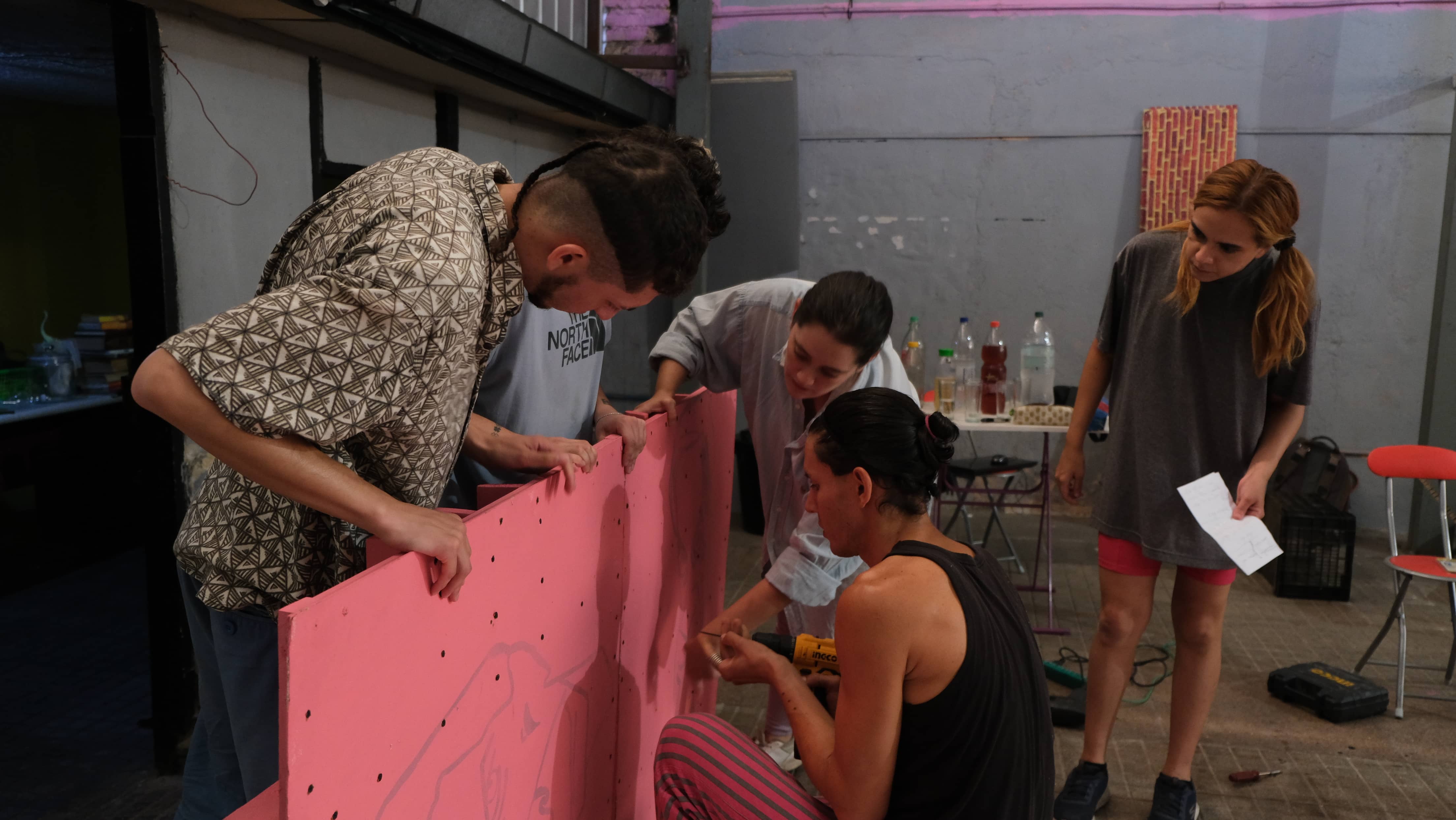 Por lo tanto, el trabajo del equipo orientado al trabajo con dispositivos funciona de forma ligada al de la colección. Así, a partir de los elementos de la colección se plantea la pregunta acerca de cómo organizar una Biblioteca Cuir y a través de qué medios, que no sean convencionales, u obvios, se puede socializar el archivo. Para cada instancia de exhibición se propusieron categorías diferentes, las que varían de acuerdo al contexto, y cuentan una contraparte material. Frente a esto, ensayamos algunas soluciones desde el diseño, así, por ejemplo, la categoría recordar se traduce en un recipiente que contenga memorias y tesoros, lo que nos llevó a construir una estructura con múltiples compartimentos, dispuestos uno al lado del otro, iban revelando un fanzine, una pieza gráfica u otro objeto. Asimismo, la categoría compartir devino en un sillón con forma de semicírculo, para invitar a leer experiencias en común. El proceso de diseño y construcción se materializa finalmente como un proyecto comunitario (figura 15). En ella, el cruce de saberes permite generar un encuentro en torno a la materialidad, donde el diseño y la construcción suceden de forma colaborativa, fortaleciendo los afectos y expandiéndose de la publicación al martillo.