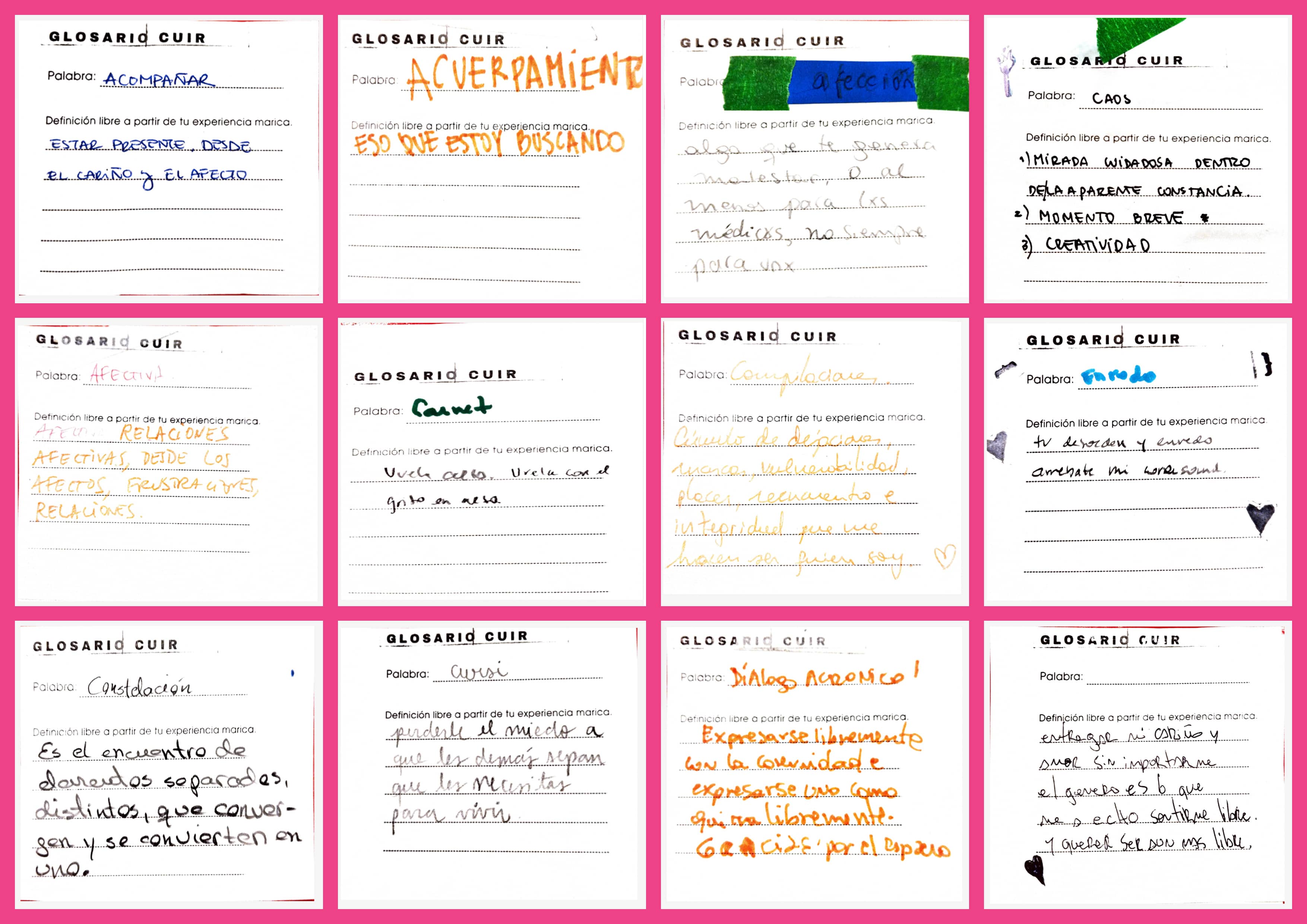 Abordamos la tensión entre lo cuir desde perspectivas latinoamericanas, decoloniales e interseccionales, considerando las dimensiones de género, clase y espacios geográficos como ejes centrales de nuestro quehacer. O eso intentamos. A partir de cierto malabarismo lingüístico intentamos dar cuenta de un malestar normativo (Sutherland, 2021). De esta manera, no solo buscamos reinventar el modo de nombrarnos, sino ampliar el campo semántico desde donde comprendemos la experiencia mediante el juego colaborativo, la ficción y la invención de glosarios. En este contexto, lo cuir se presenta como una práctica política de reapropiación, excéntrica y crítica (González, 2016), que desafía la visión patriarcal y colonial eurocéntrica, tanto en el ámbito de las artes como en el de los archivos.