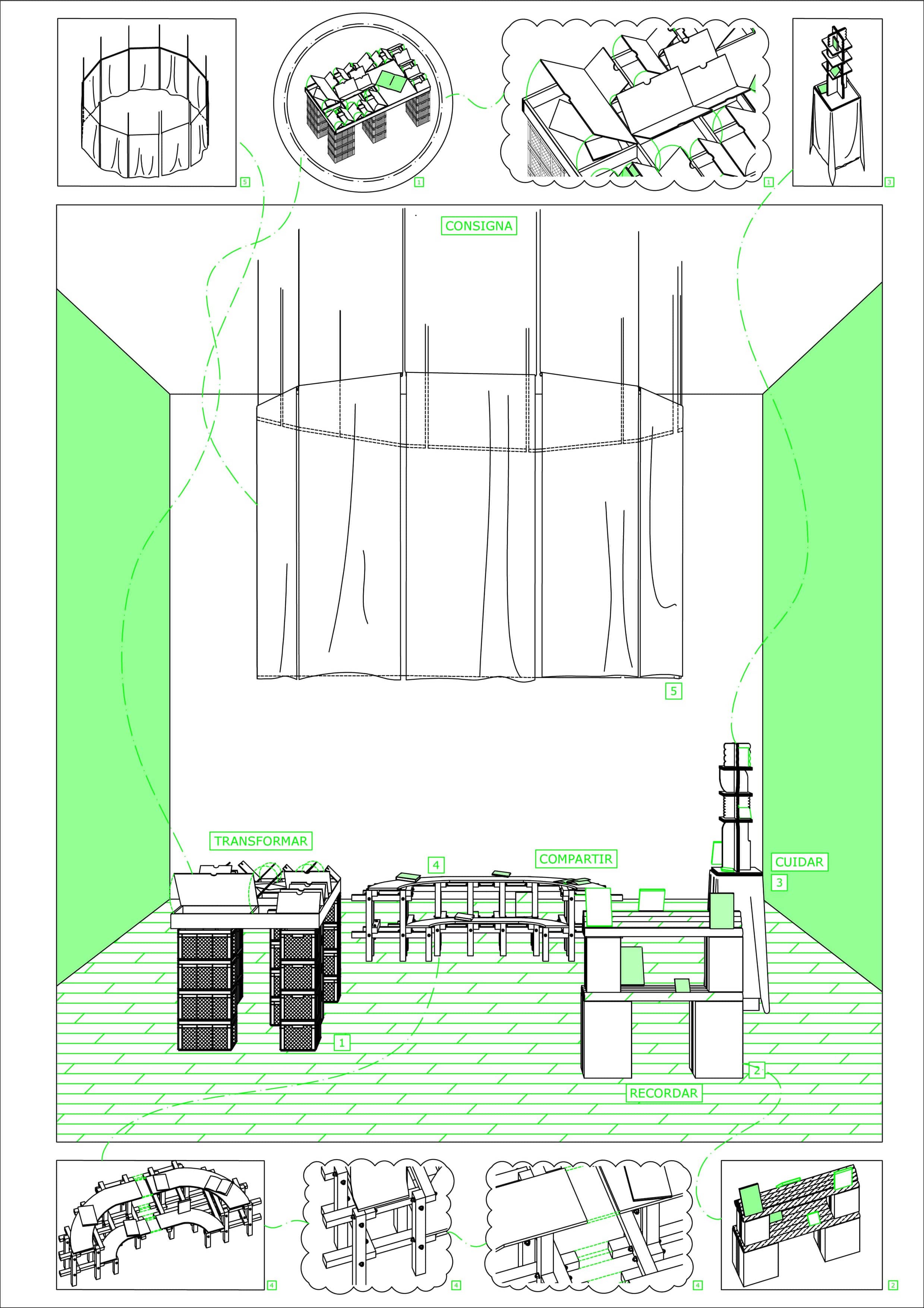 Contener una colección es pensar en su soporte y, por lo tanto, es pensar en cómo se construye. Plantearse el diseño y materialización de una biblioteca que no posee un lugar fijo, sino que (en sus inicios) funcionaba de forma esporádica en diferentes espacios, permitió sumergirnos en esa fuga a la normatividad que determina cómo debiese ser contenida una colección. Así, el diseño, campo de juego y experimentación que se adscribe a las metodologías propias del proyecto, se plantea como medio para imaginar otras aproximaciones, desde el cuerpo para moldear la forma en que usualmente se construyen los soportes.