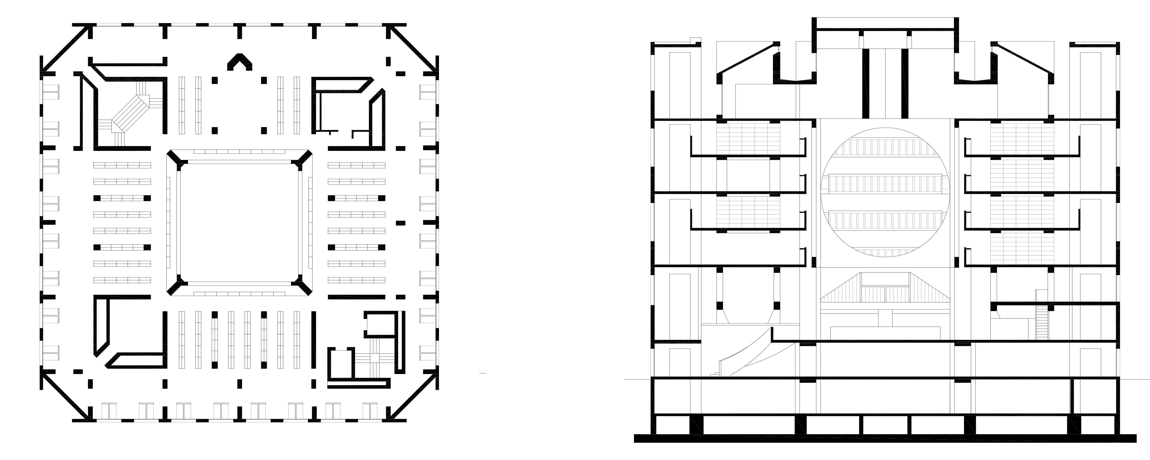 Figura 2: Phillips Exeter Library. Planta 2ª y sección axial. Planos dibujados por al autor a partir de Ronner y Jhavery, 1987, p. 297 y Giurgola, 1992, pp. 80-81.