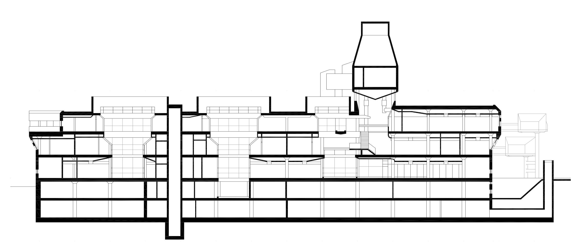 Figura 9: Biblioteca de la Universidad de Frescati (Estocolmo). Sección. Plano dibujado por el autor a partir de Egelius, 1990.